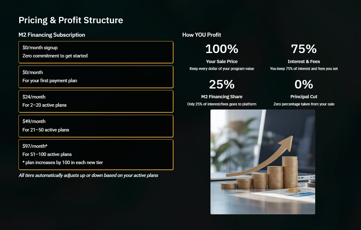 With M2 Financing, you take control. You set the terms, the interest rate, and the payment schedule for your clients. Your client wins because they get the service and transformation they need, and you win because you keep the sale and the profit.